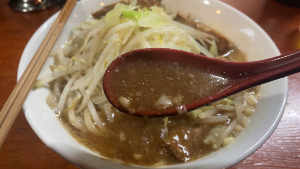 スープはこんな感じの見た目で、普通だと背脂はちょっと少なめ。背脂好きな方は無料でできる増量で注文しましょう。