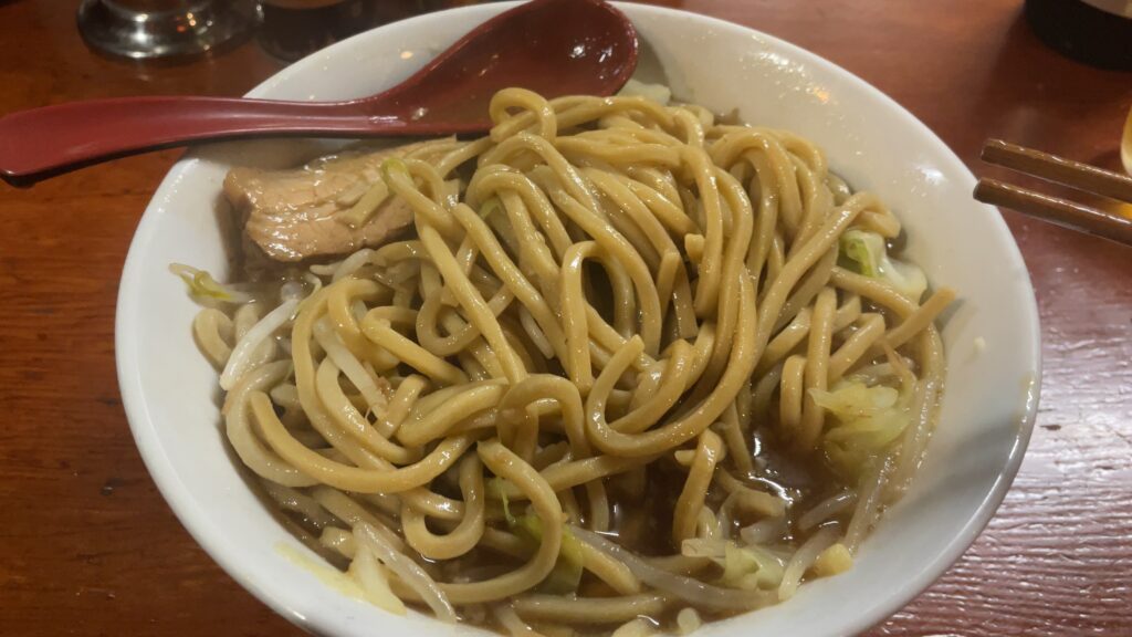 麺の量は普通のラーメンより多め。通常のラーメンの大盛りくらいあると感じました。